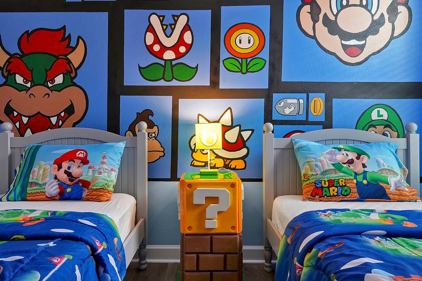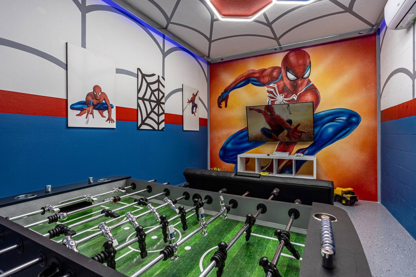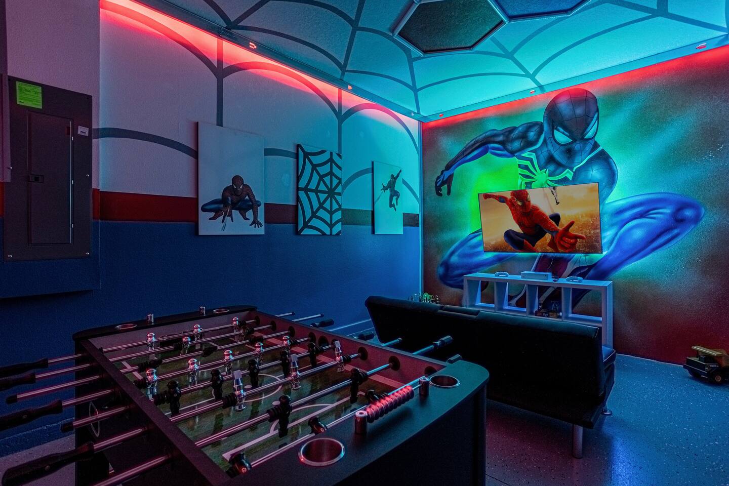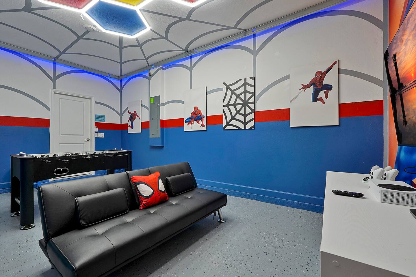 This stunning Storey Lake Resort Villa is the perfect getaway to relax and enjoy your time in Orlando, Florida. Just minutes to Disney World & within easy reach of attractions, shopping and dining. This immaculate & exceptional villa has a heated pool and spa (no additional charge) to relax in after a busy day at the parks. Family friendly featuring Super Mario & Frozen bedrooms, as well as three king size bedrooms, along with a Harry Potter themed movie loft & Spider-Man themed game room!