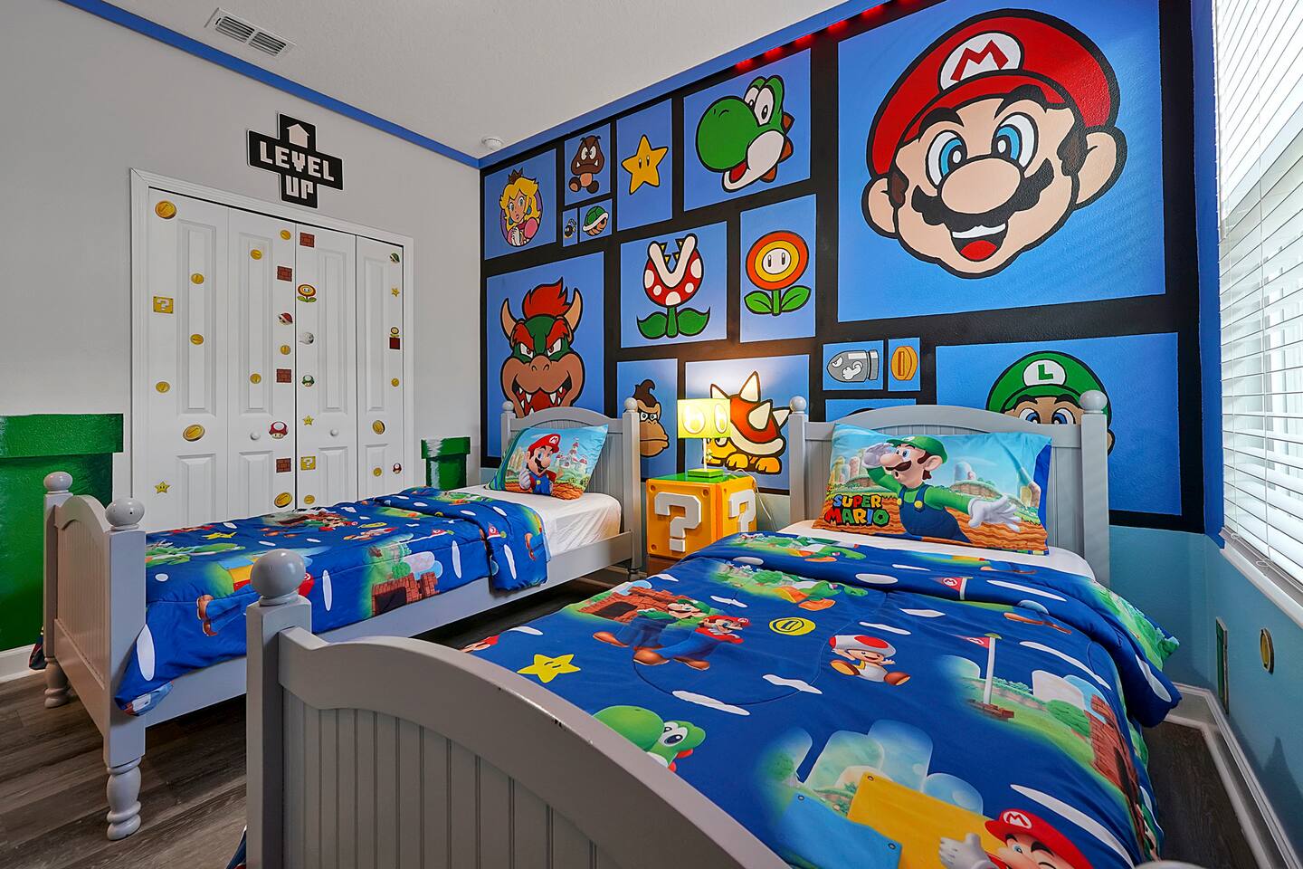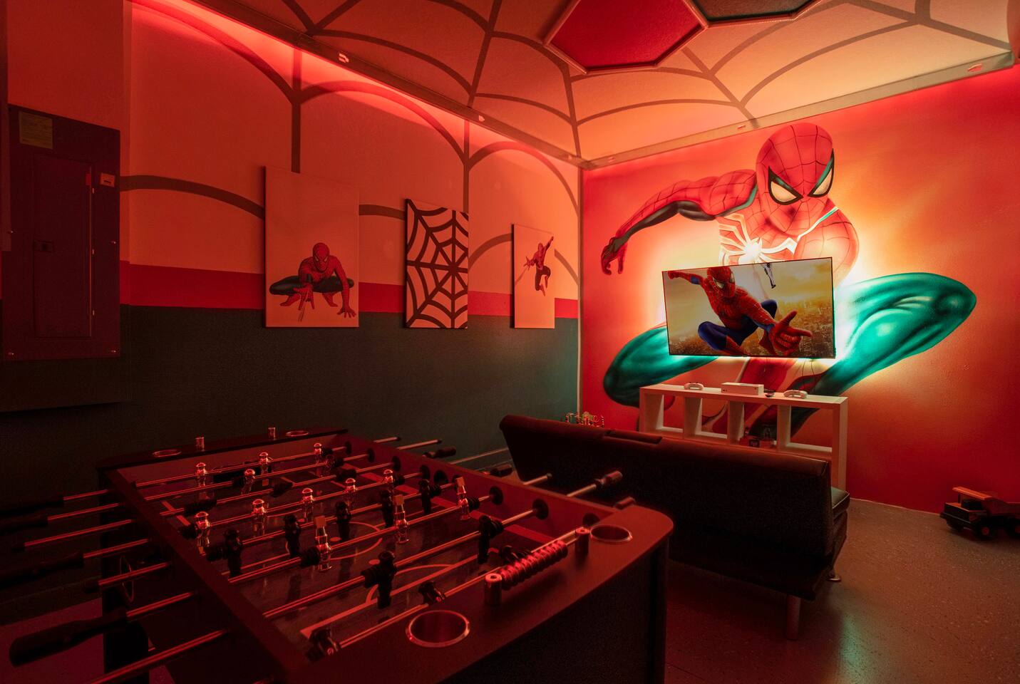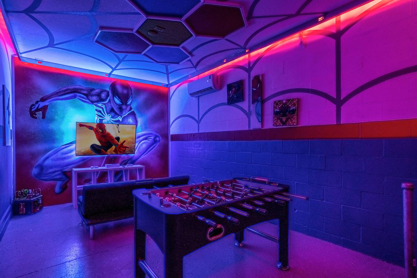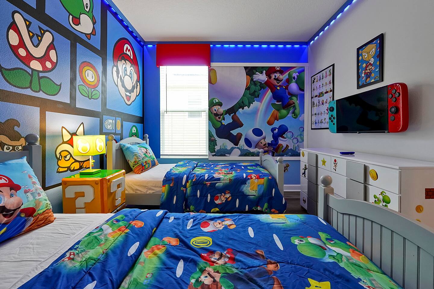 This stunning Storey Lake Resort Villa is the perfect getaway to relax and enjoy your time in Orlando, Florida. Just minutes to Disney World & within easy reach of attractions, shopping and dining. This immaculate & exceptional villa has a heated pool and spa (no additional charge) to relax in after a busy day at the parks. Family friendly featuring Super Mario & Frozen bedrooms, as well as three king size bedrooms, along with a Harry Potter themed movie loft & Spider-Man themed game room!
