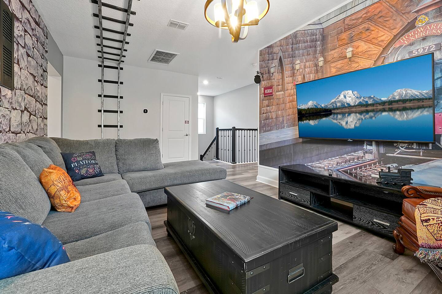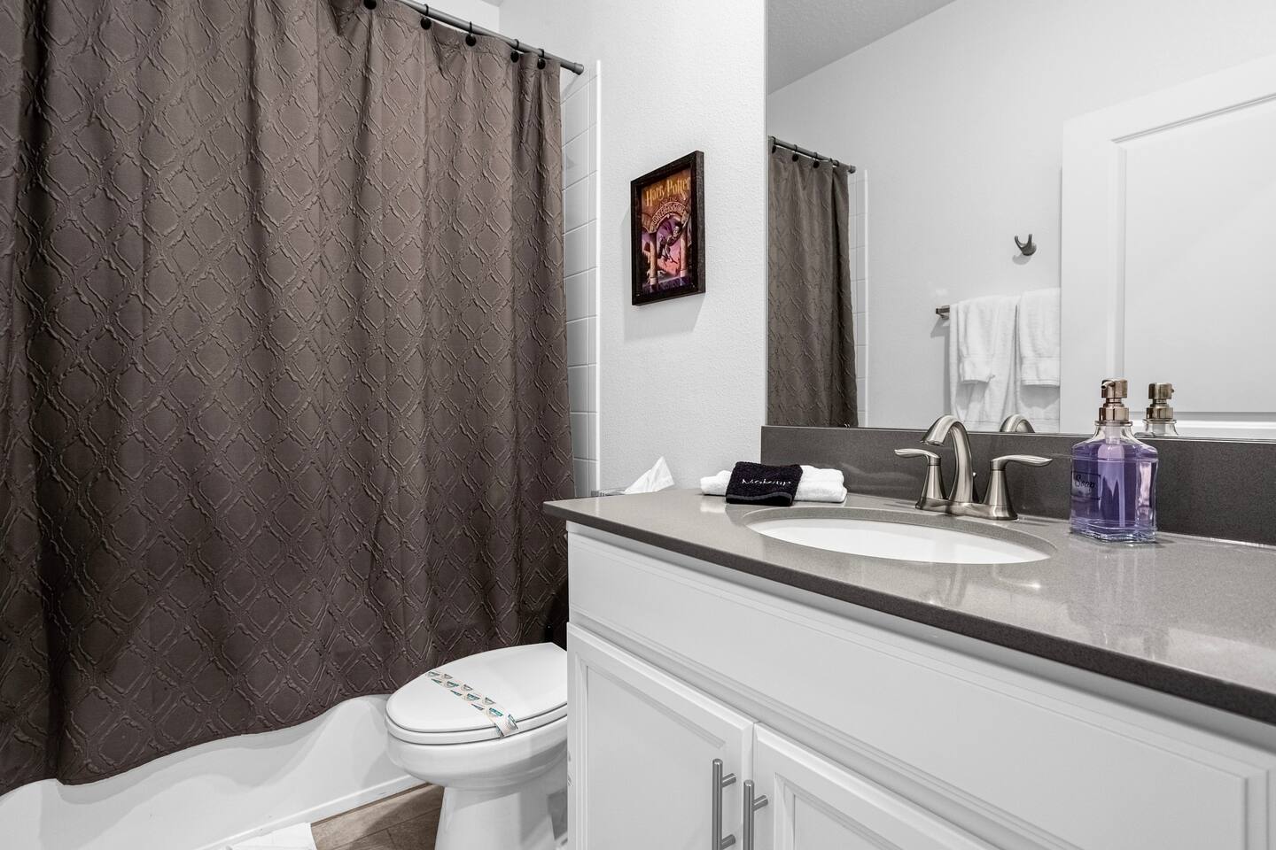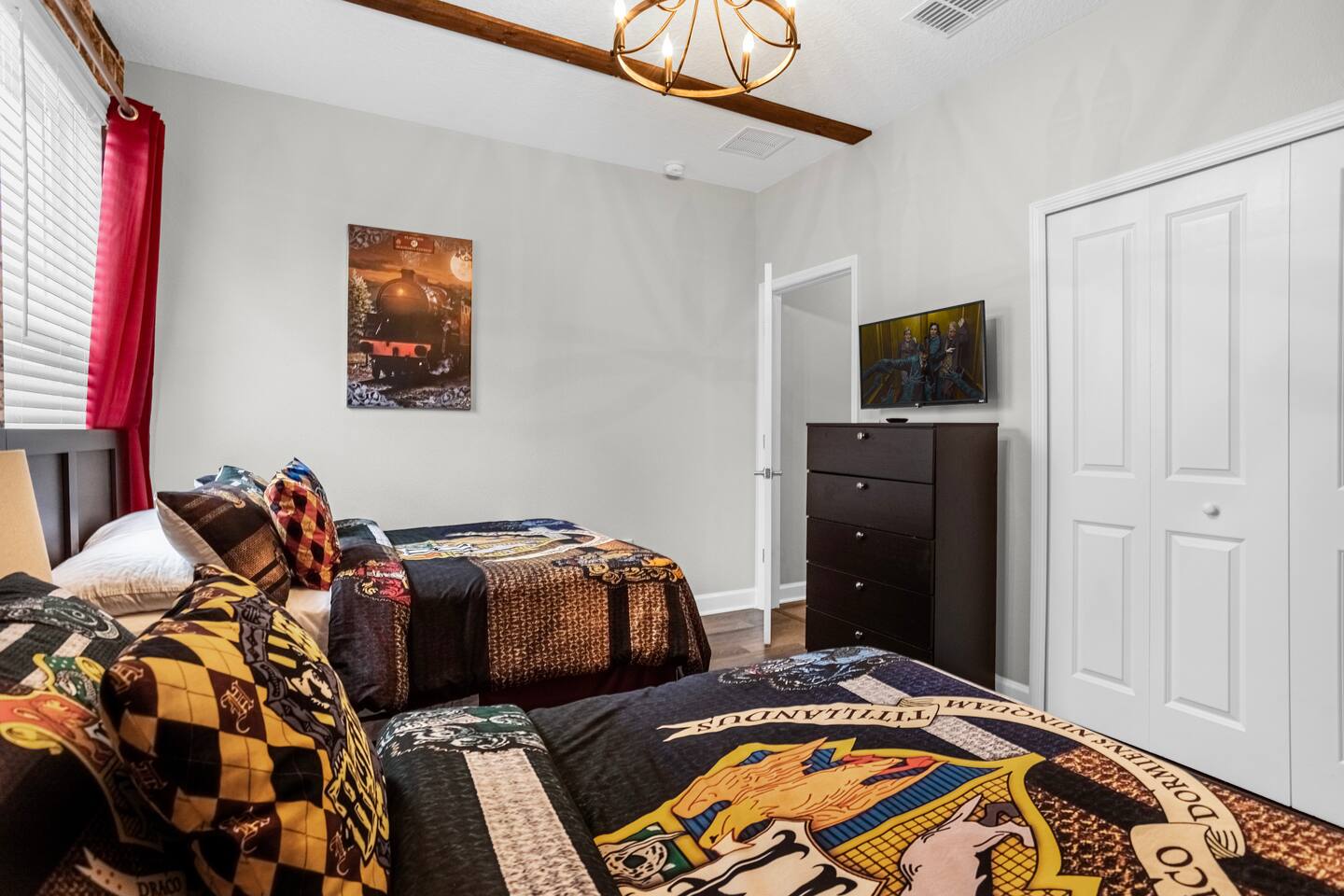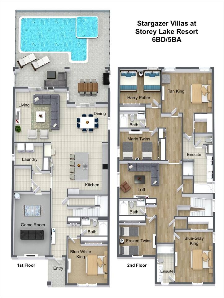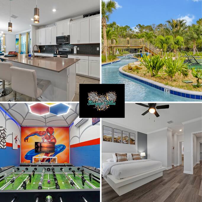 If you’re looking for a premium property and exceptional experience that your whole family is going love, here’s four reasons why we believe you’ll enjoy staying with us at Stargazer Villas: 1. The house will be super clean. We’re so fanatical about cleanliness that we even move the furniture to clean after every guest. And, solid floors in the bedrooms means no “mystery odor” absorbing carpet, either. 2. The house will be wonderfully comfortable. You’ll sleep on comfortable beds, the sheets will feel nice, the towels will be thick and you’re going to love our top-rated pillows! 3. Your stay includes a heated private pool as well as resort amenities. 4. We’ll be responsive. Your questions will get prompt responses from our dedicated team. We’ll treat you the way that we would want to be treated. 1st FLOOR: Blue Bedroom- King sized bed and smart TV Spider-Man Themed Game Room with Foosball table Modern Kitchen - Stainless appliances and stocked with the essentials for 12 people Dining Area with plenty of seating Chic Living Room with comfortable seating Full Hallway Bathroom Double washers & dryers, iron & ironing board Enclosed backyard with fenced pool & spa, outdoor seating, and grill use is available. 2nd FLOOR: Gray/Blue Primary Bedroom - King sized bed with private bathroom and smart TV. Tan Primary Suite - King sized bed with ensuite and smart TV. Harry Potter Themed Bedroom - 2 Double sized beds and smart TV. Super Mario Themed Bedroom – 2 Twin beds and smart TV. Harry Potter Themed Movie Loft with big smart TV. Frozen Themed Bedroom – 2 Twin beds and smart TV. 2 Full Hallway Bathrooms POOL & SPA: After a busy day, come home and relax in your heated pool and spa (facing north). Or, enjoy a nice dinner together by the pool at the comfortable outdoor dining set. STOREY LAKE RESORT, HIDEAWAY & BRONSON CLUBHOUSES Our super clean home is located in Storey Lake Resort, one of the newest and most sought after resort communities in the Central Florida area complete with gated access and a 24 hour security staff. Your vacation home includes full access to two clubhouses, the Hideaway Club and the newly built Bronson Club (both only a quick shuttle ride) featuring: HIDEAWAY CLUB: * Double water slide * Heater zero-entry main pool and lazy river * Spa * Water Slides: 36" height requirement * Children’s water park * State-of-the-art fitness center * Sand volleyball courts * Tiki bar with a great menu/drinks for poolside dining * Basketball court * Hammock garden / tropical walk * Restaurant and Bar * Ice-Cream Shop * 9-Hole Mini golf course (additional charge) * Kayak Rentals for the lake front (additional charge) * Private cabanas available for additional charge BRONSON CLUB: * Resort style heated swimming pool and lazy river * Spa * Music * Billiards, darts, and cards game room * Computer & media room * State of the art fitness center * Pirate themed playground * Basketball court * Restaurant and Bar * Private cabanas available for additional charge Resort Hours of Operations Clubhouse: 9 am - 9 pm Restaurant, Bar, Ice Cream Shop and Boat House: 10 am - 9 pm Fitness Center: 9 am - 9 pm Hours may change based on the season or unforeseen circumstances. **Individual charges may occur for extras Resort and club house amenities are subject to closure without any notice. We do not have any control over the Resort policies and cannot be held accountable.