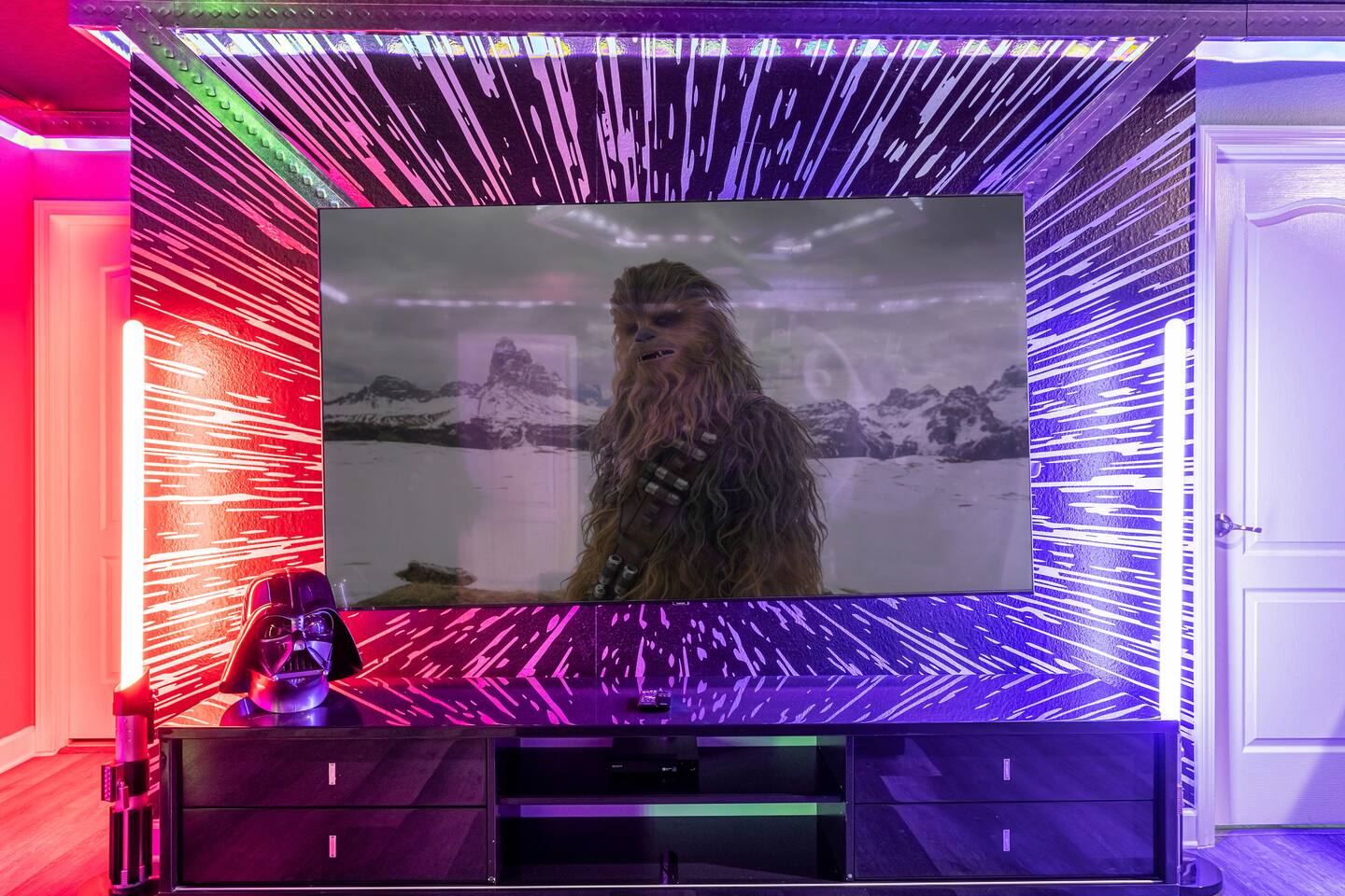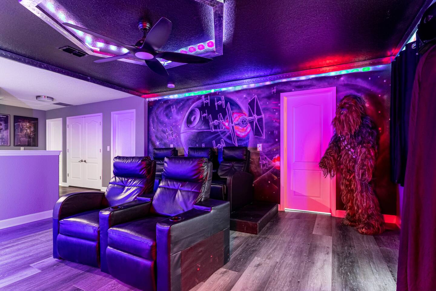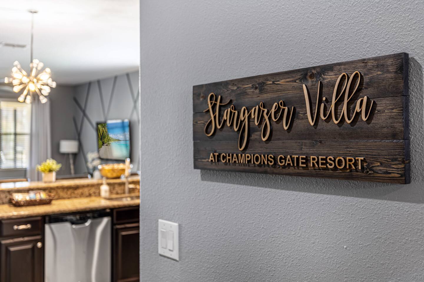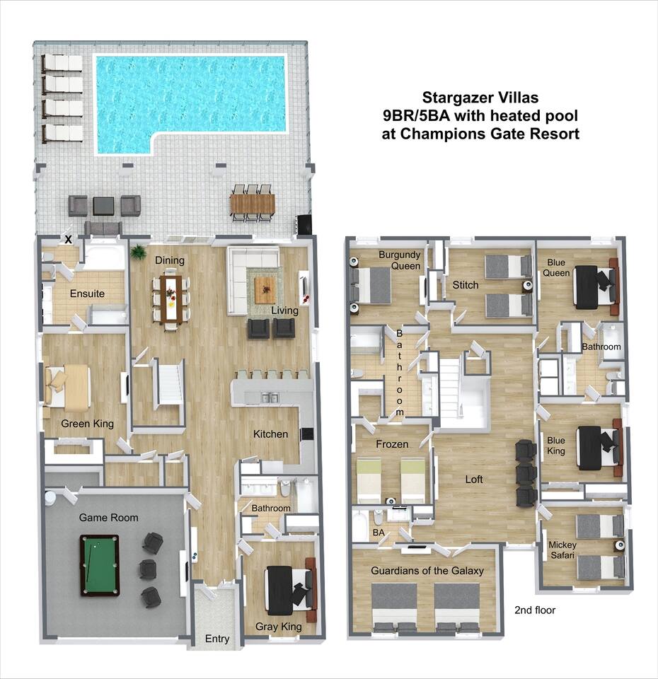 If you’re looking for a premium property and exceptional experience that your whole family is going love, here’s four reasons why we believe you’ll enjoy staying with us at Stargazer Villas: 1. The house will be super clean. We’re so fanatical about cleanliness that we even move the furniture to clean after every guest. And, solid floors in the bedrooms means no “mystery odor” absorbing carpet, either. 2. The house will be wonderfully comfortable. You’ll sleep on comfortable beds, the sheets will feel nice, the towels will be thick and you’re going to love our top-rated pillows! 3. Your stay includes a heated private pool as well as resort amenities. 4. We’ll be responsive. Your questions will get prompt responses from our dedicated team. We’ll treat you the way that we would want to be treated. 1st FLOOR: Master Bedroom (Blue& Gray) - King sized bed, connected and shared full bathroom, with 60” TV Master Bedroom Suite (Green) - King sized bed, connected private bathroom, and 55” TV Harry Potter Game Room - Pool table, X-Box, Ping Pong Table, and 65” Smart TV (Air Conditioned) Kitchen - New stainless steel appliances and stocked with the basics for 16 people plus 5 barstools. Dining Area - Seating for 10 people. 2nd FLOOR: Queen Bedroom (Burgundy) - Queen sized bed and 42” TV with connected/shared full bathroom. Frozen Bedroom - 2 twin sized beds, color changing LED lights, 32” TV, with connecting/shared bathroom Guardians of the Galaxy Bedroom - 2 Queen sized beds, color changing LED lights, and 42” TV. Mickey Characters Safari Bedroom - 2 twin sized beds, and 42” TV. King Bedroom (Blue) - King sized bed, 42” TV with connected/shared full bathroom. Queen Bedroom (Blue/Gray) - Queen sized bed, 42” TV with connected/shared full bathroom. Lilo & Stitch Bedroom - 2 Twin sized beds, and color changing LED lights. Star Wars Movie Loft - leather recliners, color changing LED lights, and color immersive 75” Smart TV. Double washers & dryers, iron & ironing board. Full bathroom PRIVATE POOL: After a busy day, come home and relax in your heated pool (which faces East). Or, enjoy a nice dinner together by the pool under the covered patio with comfortable outdoor dining set. We provide pool towels. CHAMPIONS GATE RESORT - OASIS CLUBHOUSE & RETREAT CLUBHOUSE: Our home is located in central Florida's iconic gated community, Champions Gate Resort, one of the largest resort communities in the area complete with gate access and 24 hour security staff. Your vacation home includes access to the Oasis Club Amenities featuring: • Resort Style Heated Pool with Water Slide • Spa • Zero Entry Heated Lazy River • Interactive Splash Zone for kids • Full-ServiceTiki Bar • Sand Volleyball Courts • Tennis Center: Stadium Court - (6) Tennis Courts • State -of -the -Art Fitness Center • Locker Rooms • Movie Theatre • Arcade Game Room • Kids Activity Center • Business Center • Multiple Common Areas • Grill Room Restaurant & Bar **Private cabanas available for additional charge** You also have access to Retreat Club Amenities featuring: • Water slides (40" height requirement single rider) • Zero Entry Heated Pool • Interactive Splash Pad • Mini Golf • Hammocks • Restaurant • Sundries Shop **Additional charges for use of the golf course, private cabanas, restaurant and bar. Rentals are first come first serve** Resort and club house amenities are subject to closure without any notice. We do not have any control over the Resort policies and cannot be held accountable.