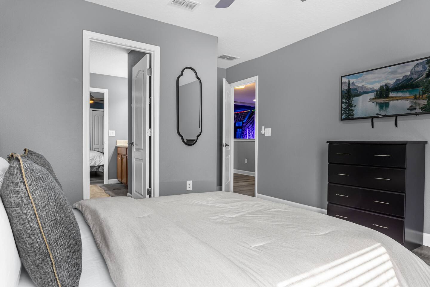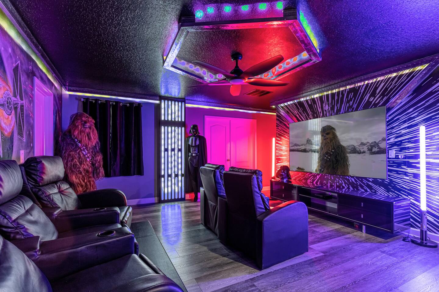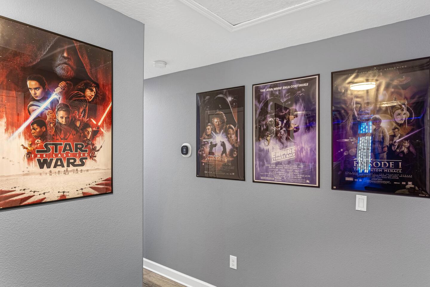If you’re looking for a premium property and exceptional experience that your whole family is going love, here’s four reasons why we believe you’ll enjoy staying with us at Stargazer Villas: 1. The house will be super clean. We’re so fanatical about cleanliness that we even move the furniture to clean after every guest. And, solid floors in the bedrooms means no “mystery odor” absorbing carpet, either. 2. The house will be wonderfully comfortable. You’ll sleep on comfortable beds, the sheets will feel nice, the towels will be thick and you’re going to love our top-rated pillows! 3. Your stay includes a heated private pool as well as resort amenities. 4. We’ll be responsive. Your questions will get prompt responses from our dedicated team. We’ll treat you the way that we would want to be treated. 1st FLOOR: Master Bedroom (Blue& Gray) - King sized bed, connected and shared full bathroom, with 60” TV Master Bedroom Suite (Green) - King sized bed, connected private bathroom, and 55” TV Harry Potter Game Room - Pool table, X-Box, Ping Pong Table, and 65” Smart TV (Air Conditioned) Kitchen - New stainless steel appliances and stocked with the basics for 16 people plus 5 barstools. Dining Area - Seating for 10 people. 2nd FLOOR: Queen Bedroom (Burgundy) - Queen sized bed and 42” TV with connected/shared full bathroom. Frozen Bedroom - 2 twin sized beds, color changing LED lights, 32” TV, with connecting/shared bathroom Guardians of the Galaxy Bedroom - 2 Queen sized beds, color changing LED lights, and 42” TV. Mickey Characters Safari Bedroom - 2 twin sized beds, and 42” TV. King Bedroom (Blue) - King sized bed, 42” TV with connected/shared full bathroom. Queen Bedroom (Blue/Gray) - Queen sized bed, 42” TV with connected/shared full bathroom. Lilo & Stitch Bedroom - 2 Twin sized beds, and color changing LED lights. Star Wars Movie Loft - leather recliners, color changing LED lights, and color immersive 75” Smart TV. Double washers & dryers, iron & ironing board. Full bathroom PRIVATE POOL: After a busy day, come home and relax in your heated pool (which faces East). Or, enjoy a nice dinner together by the pool under the covered patio with comfortable outdoor dining set. We provide pool towels. CHAMPIONS GATE RESORT - OASIS CLUBHOUSE & RETREAT CLUBHOUSE: Our home is located in central Florida's iconic gated community, Champions Gate Resort, one of the largest resort communities in the area complete with gate access and 24 hour security staff. Your vacation home includes access to the Oasis Club Amenities featuring: • Resort Style Heated Pool with Water Slide • Spa • Zero Entry Heated Lazy River • Interactive Splash Zone for kids • Full-ServiceTiki Bar • Sand Volleyball Courts • Tennis Center: Stadium Court - (6) Tennis Courts • State -of -the -Art Fitness Center • Locker Rooms • Movie Theatre • Arcade Game Room • Kids Activity Center • Business Center • Multiple Common Areas • Grill Room Restaurant & Bar **Private cabanas available for additional charge** You also have access to Retreat Club Amenities featuring: • Water slides (40" height requirement single rider) • Zero Entry Heated Pool • Interactive Splash Pad • Mini Golf • Hammocks • Restaurant • Sundries Shop **Additional charges for use of the golf course, private cabanas, restaurant and bar. Rentals are first come first serve** Resort and club house amenities are subject to closure without any notice. We do not have any control over the Resort policies and cannot be held accountable.